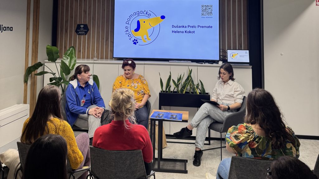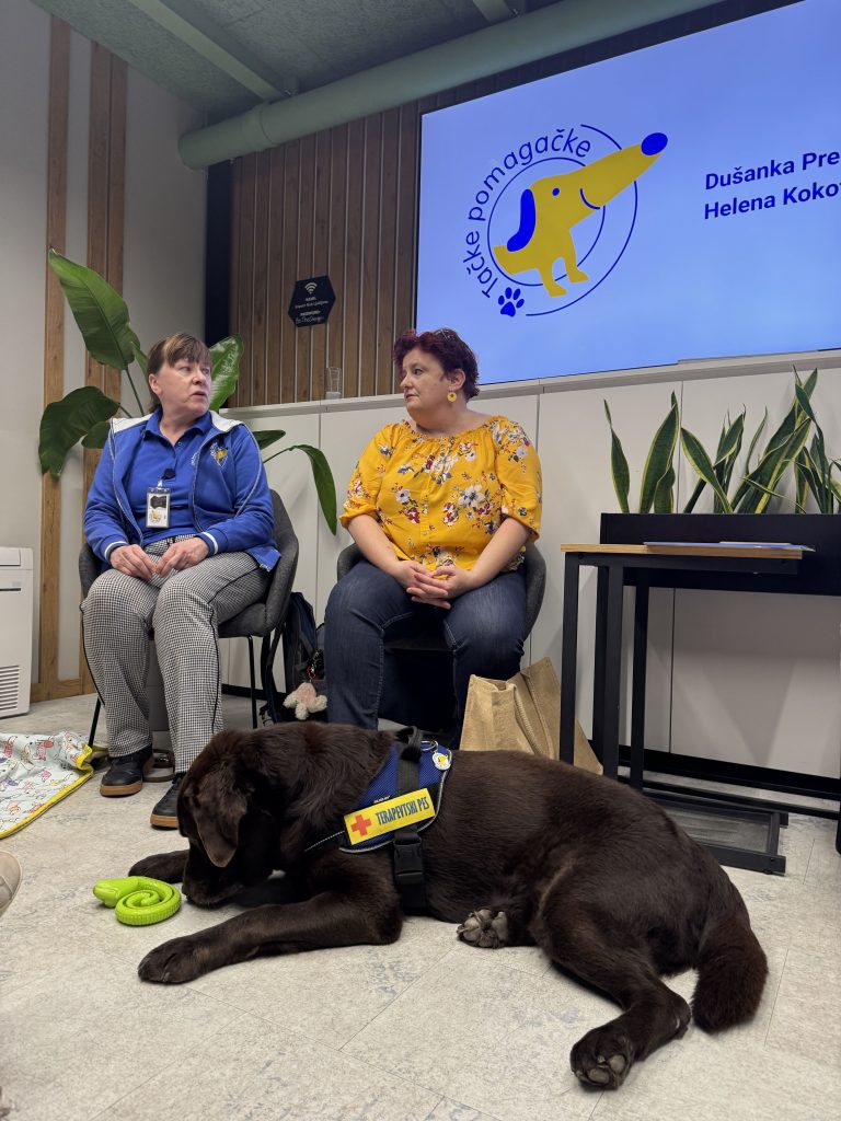 Po odmoru je sledil moderiran pogovor o terapiji s pomočjo psov. Pogovor je vodila Tina Fornazarič, gostji pa sta bili Dušanka Prelc Premate, predsednica Slovenskega društva za terapijo s pomočjo psov Tačke pomagačke, in Helena Kokot, dipl. socialna pedagoginja. S seboj sta pripeljali tudi terapevtskega psa Thora, ki je s svojo umirjenostjo in prisotnostjo ustvaril poseben občutek varnosti. Udeleženci so spoznali, kako potekajo terapevtski obiski, komu so namenjeni ter kakšen je njihov učinek na duševno počutje posameznika.
